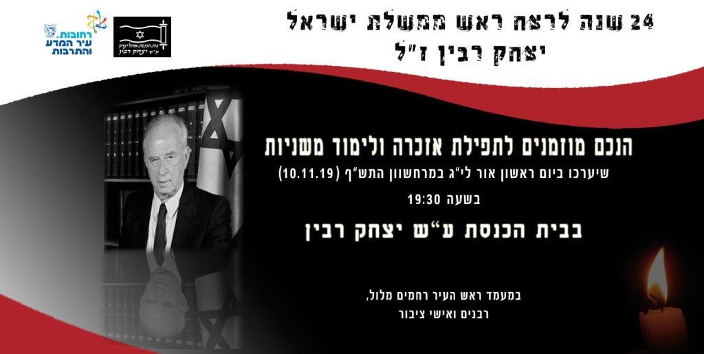 תפילת האזכרה ולימוד המשניות לציון 24 שנים לרצח רוה’מ ושר הביטחון יצחק רבין יתקיימו ביום ראשון אור לי’ג בחשוון- 10/11 בשעה 1930 בבית הכנסת ע’ש יצחק רבין במתחם בית הספר אמית ברחוב לחי’ ברחובות
