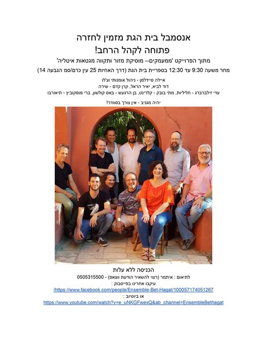 אנסמבל בית הגת הוא הרכב נהדר, אם יורשה לי, שכל משתתפיו מוזיקאים מיוחדים ומעולים. הפרויקט של מוזיקה איטלקית יהודית שמשוחזרת בחלקה מהקלטות הספריה הלאומית, יוצא מקסים ומיוחד. דיסק אחד כבר יצא, וזכה לשבחים, ובצדק, אם יורשה לי:). השני בתנור עכשיו, ומחר בבוקר נתאמן על שלושת הקטעים האחרונים שנקליט השבוע. מוזמנים להיות עדים לתהליך. להלן הפרטים