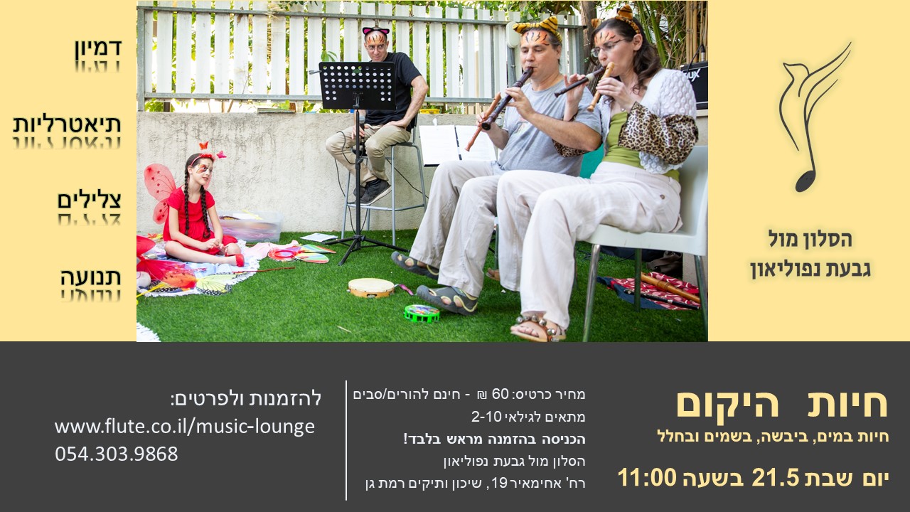 בשבת: מופע לילדים (ומלוויהם:)) בנושא “חיות היקום” בו אנגן במגוון כלים עם תמר מלזר קרימולובסקי, ונסקור בעזרתו של השחקן ארז גרוסברג חיות בארץ, בים, באוויר ובחלל