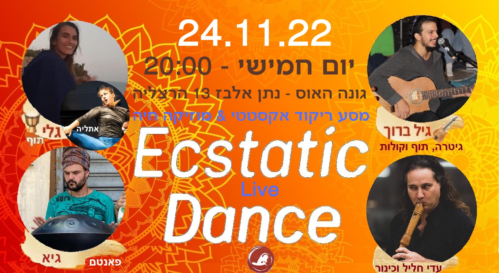 מופע אקסטטיק-דאנס בהרצליה. מדובר על אחלה חוויה למי שאוהב לרקוד לצלילי מוזיקה מאולתרת עם וייב שבטי. והרי הפוסטר ובו הפרטים